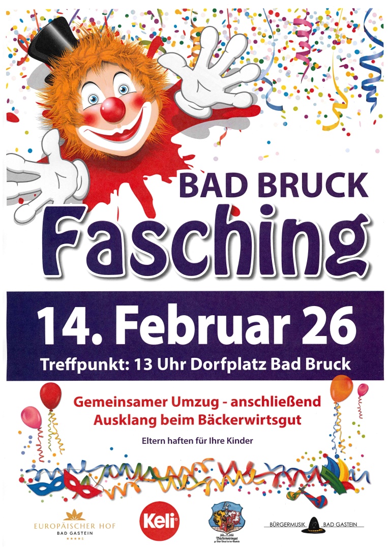 Alljährliches Highlight für die Kinder ist der Fasching in Badbruck / Kötschachdorf. Die Kinder sind farbenfroh verkleidet und marschieren gemeinsam mit Ihren, oftmals auch verkleideten Eltern und Großeltern eine kleine Runde vom Gasthaus Bäckerwirtgut zum Golfplatz, mit Stopps beim Hotel Europäischer Hof und Krapfenpause bei der Familie Grutschnigg und retour zum Dorfplatz. Mit von der Partie ist auch die Bad Gasteiner Bürgermusik, die für die passende Musik sorgt. Für jedes Kind gibt es gratis Faschingskrapfen, Würstel und Getränke.