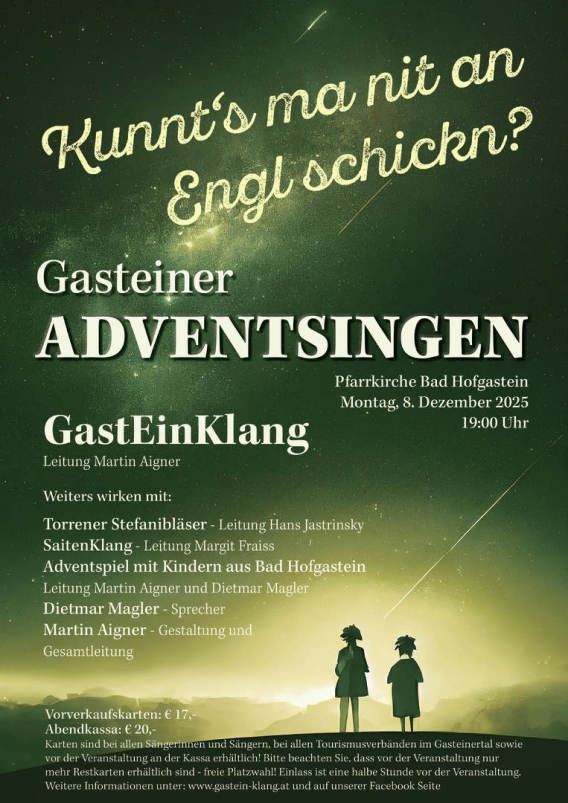 Dem Titel gerecht werden auch Kinder aus Bad Hofgastein, die in engagierter Probenarbeit ein auflockerndes, herzerfrischendes Hirtenspiel einstudiert haben. Der Sprecher, Dietmar Magler, rundet mit einfühlsamen Texten aus eigener Feder das harmonische Programm ab. Die musikalische Gesamtleitung obliegt dem Chorleiter von GastEinKlang, Martin Aigner.