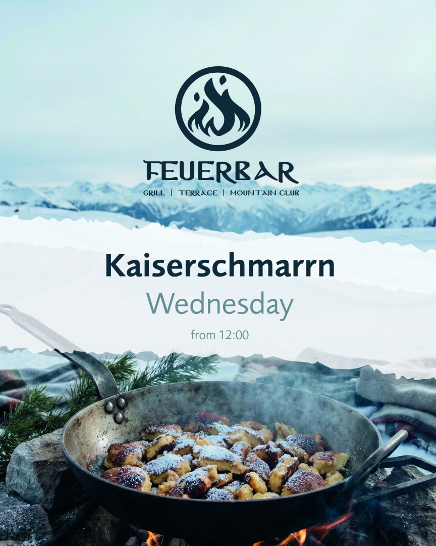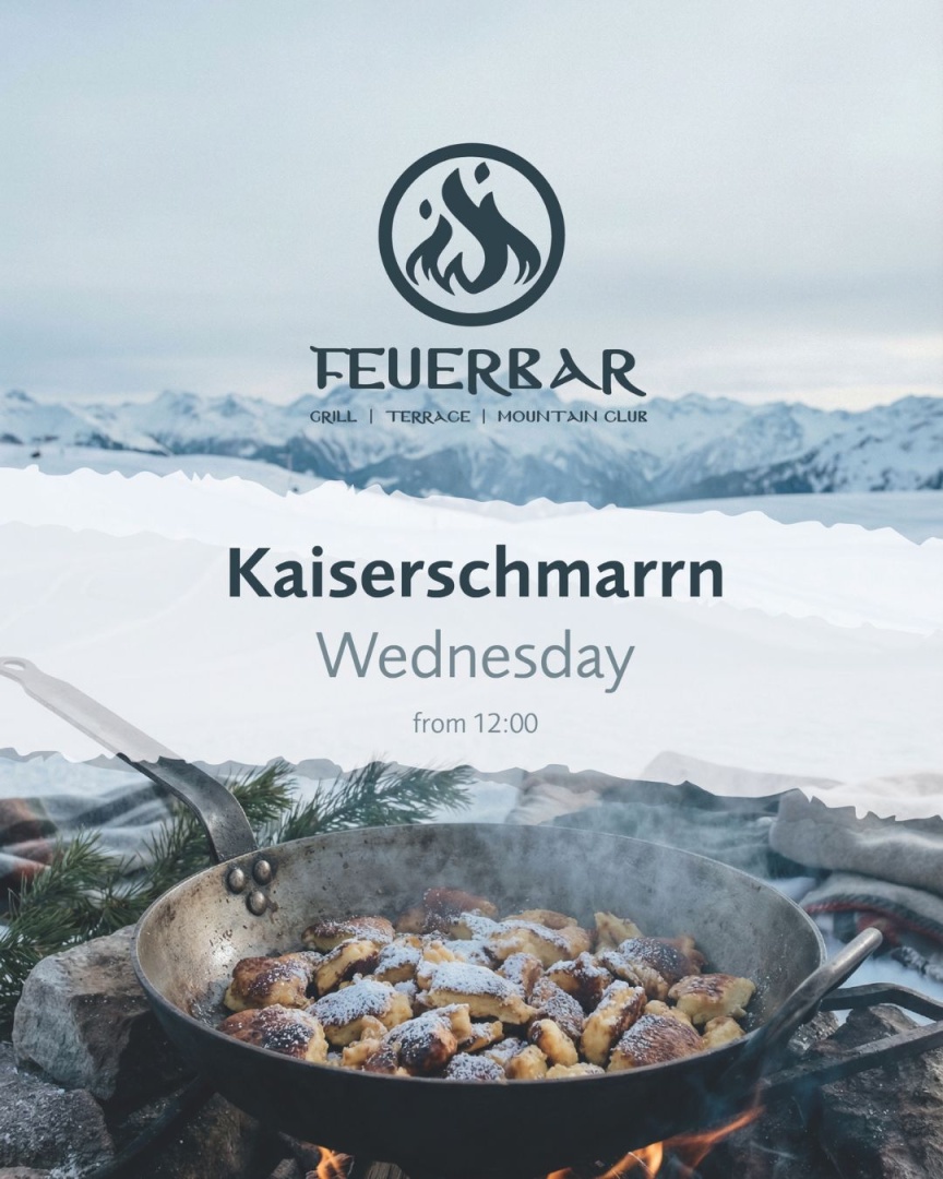 Jeden Mittwoch ab 12:00 Uhr servieren wir unseren hausgemachten Kaiserschmarrn: goldbraun ausgebacken, flaumig gezupft und frisch aus der Pfanne. Ein Klassiker der österreichischen Küche, serviert in entspannter Mountain Club-Atmosphäre. Zwischen offenem Feuer, gemütlichem Interior und guten Drinks wird der Kaiserschmarrn zum perfekten Begleiter durch den Mittwoch. Zum Teilen. Als süßer Abschluss. Oder einfach, weil Mittwoch ist. Kaiserschmarrn essen in der Feuerbar. Mitten in den Bergen, mitten im Genuss.