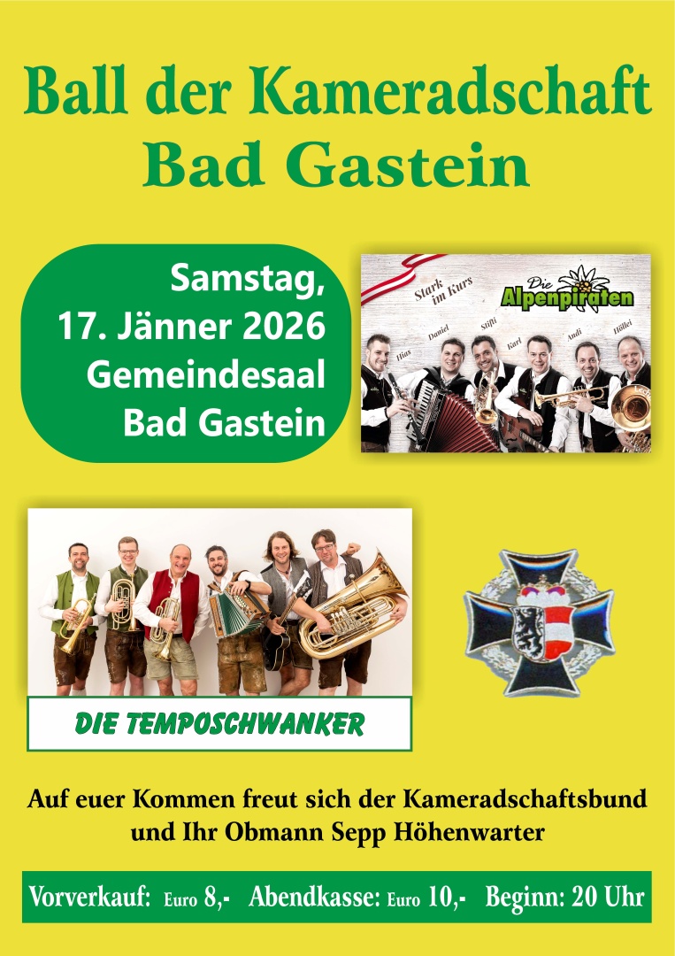 Der Kameradschaftsball gehört zu den beliebtesten Faschingsbällen in Bad Gastein. Gute Unterhaltung ist garantiert, für die musikalische Umrahmung sorgen von 20:00 bis 22:00 Uhr "Die Temposchwanker" und von 22:00 bis 03:00 Uhr "Die Alpenpiraten". Happy hour von 20:00 - 22:00 Uhr.