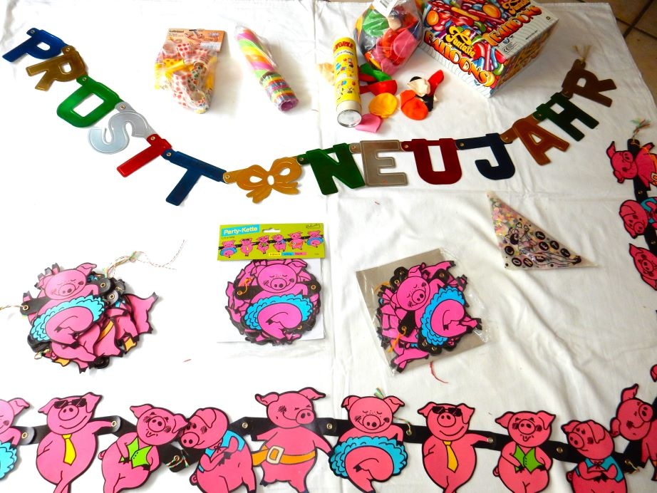 Habe auch noch viele bunte Papiergirlanden, Regenbogenfächer, Lampions etc.,