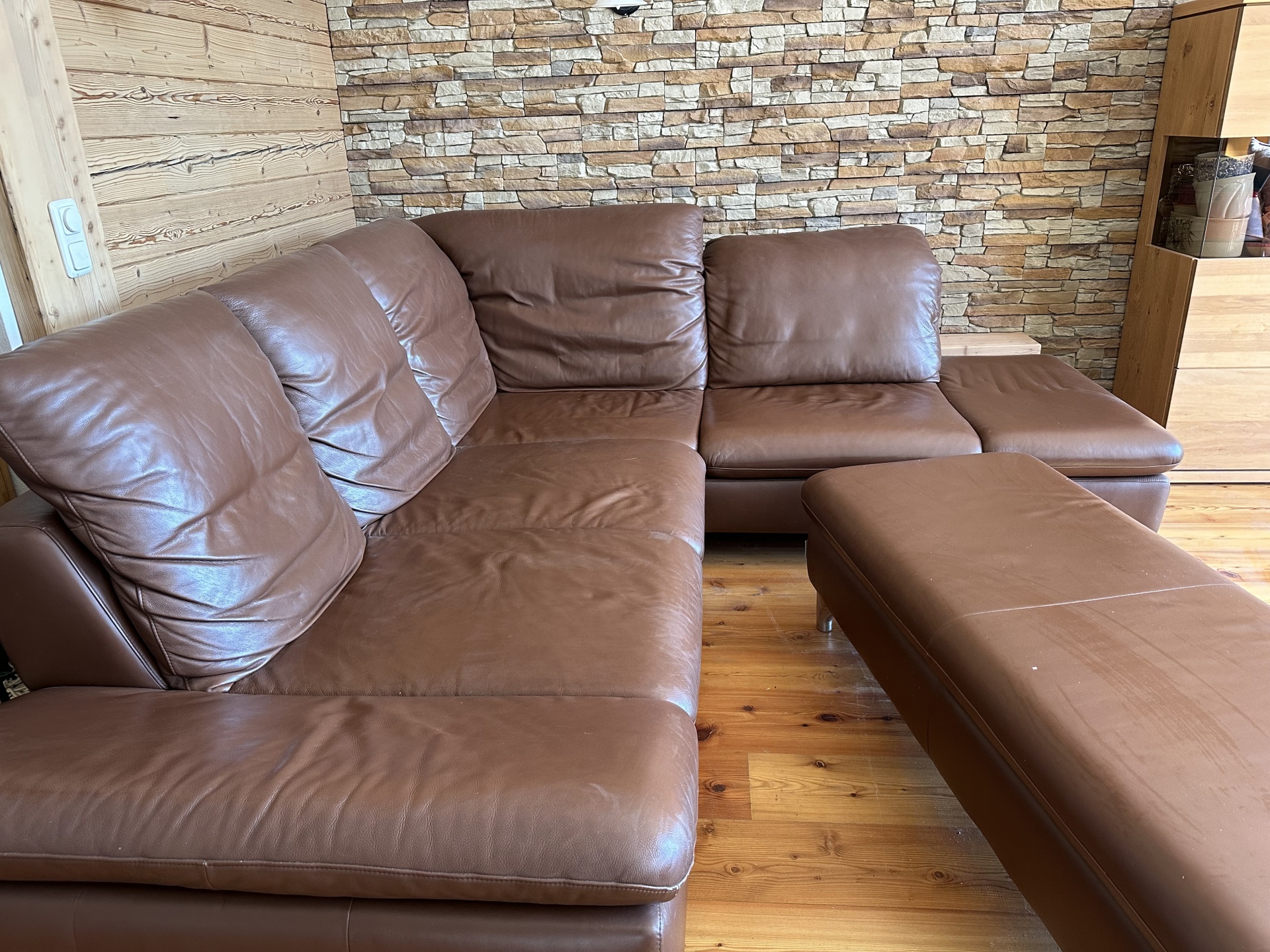 250x230 cm und tiefe 105 cm. Von der Firma W. Schilling, echt Leder inkl. Hocker. Selbstabholung.