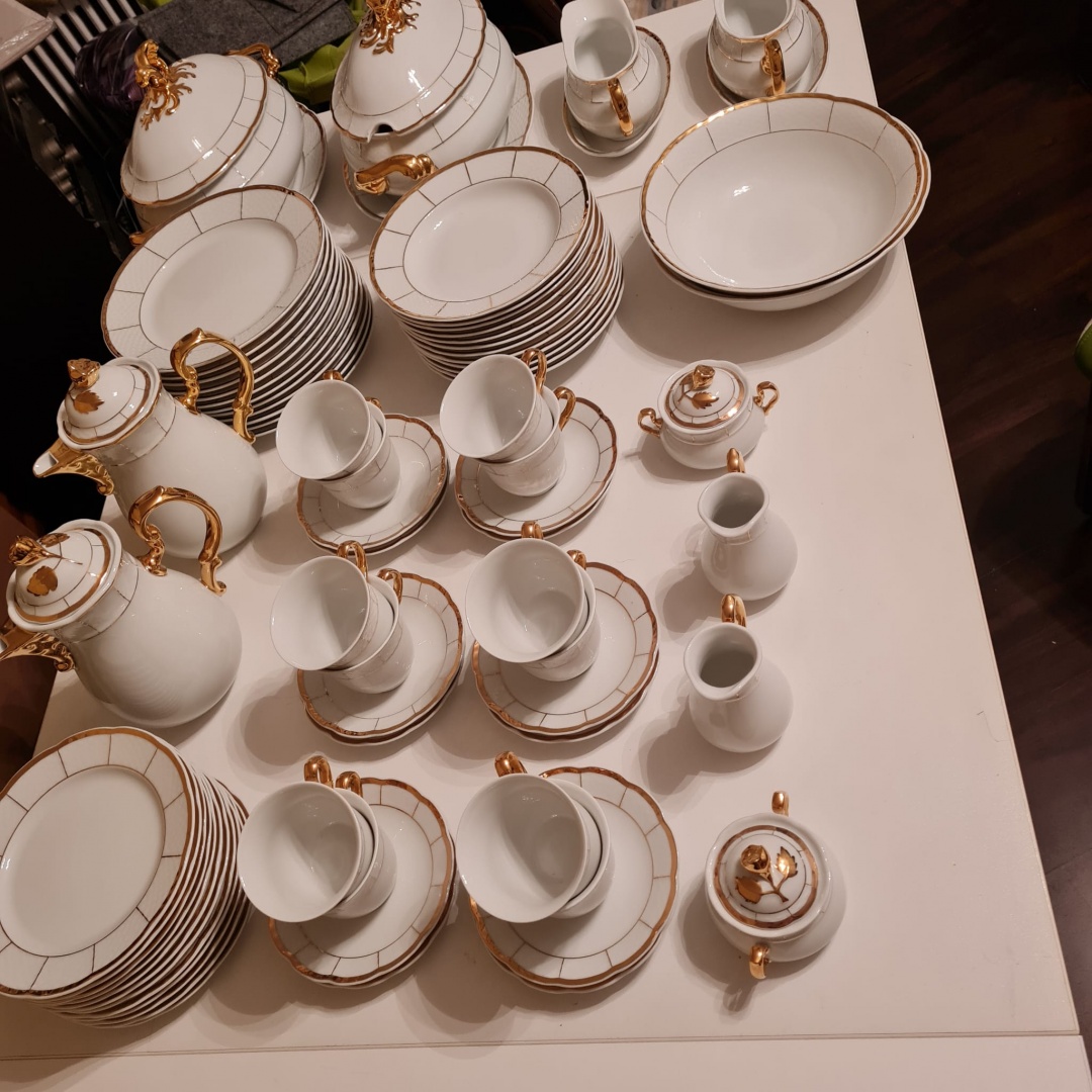 komplettes 78 tlg. makelloses weißes Porzellangeschirr mit Goldrand von der Marke Firma Thun 1794 an Liebhaber zu verkaufen Preis auf Anfrage