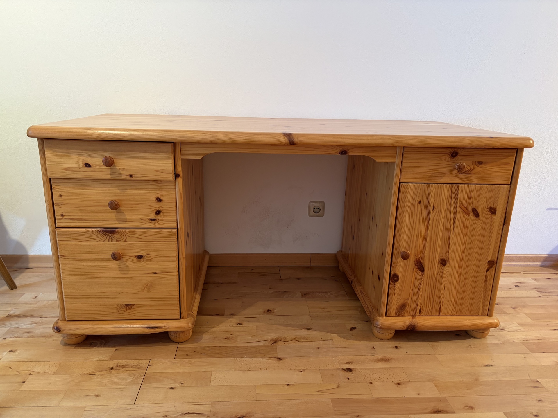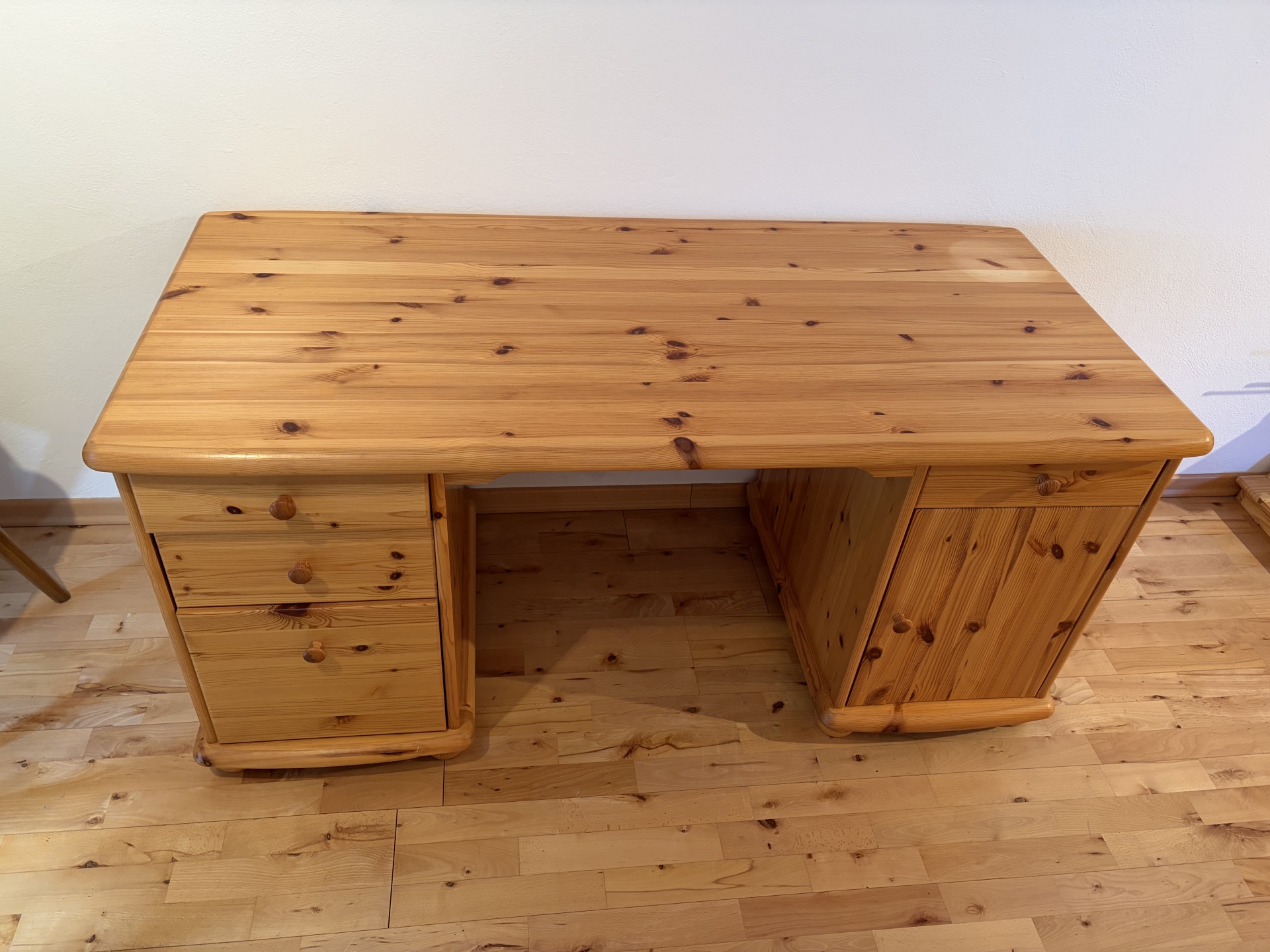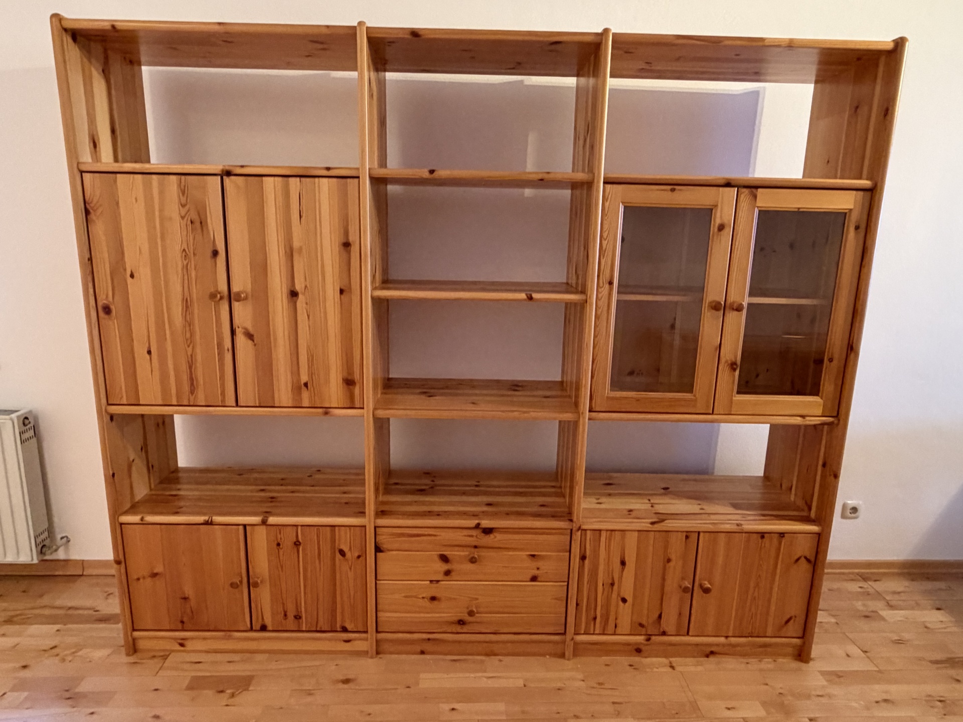 Schreibtisch mit Schrankwand und Regal aus Massivholz Kiefer in sehr gepflegtem Zustand zu verkaufen. Ideal für Jugendzimmer, Appartement oder Wohnzimmer geeignet.