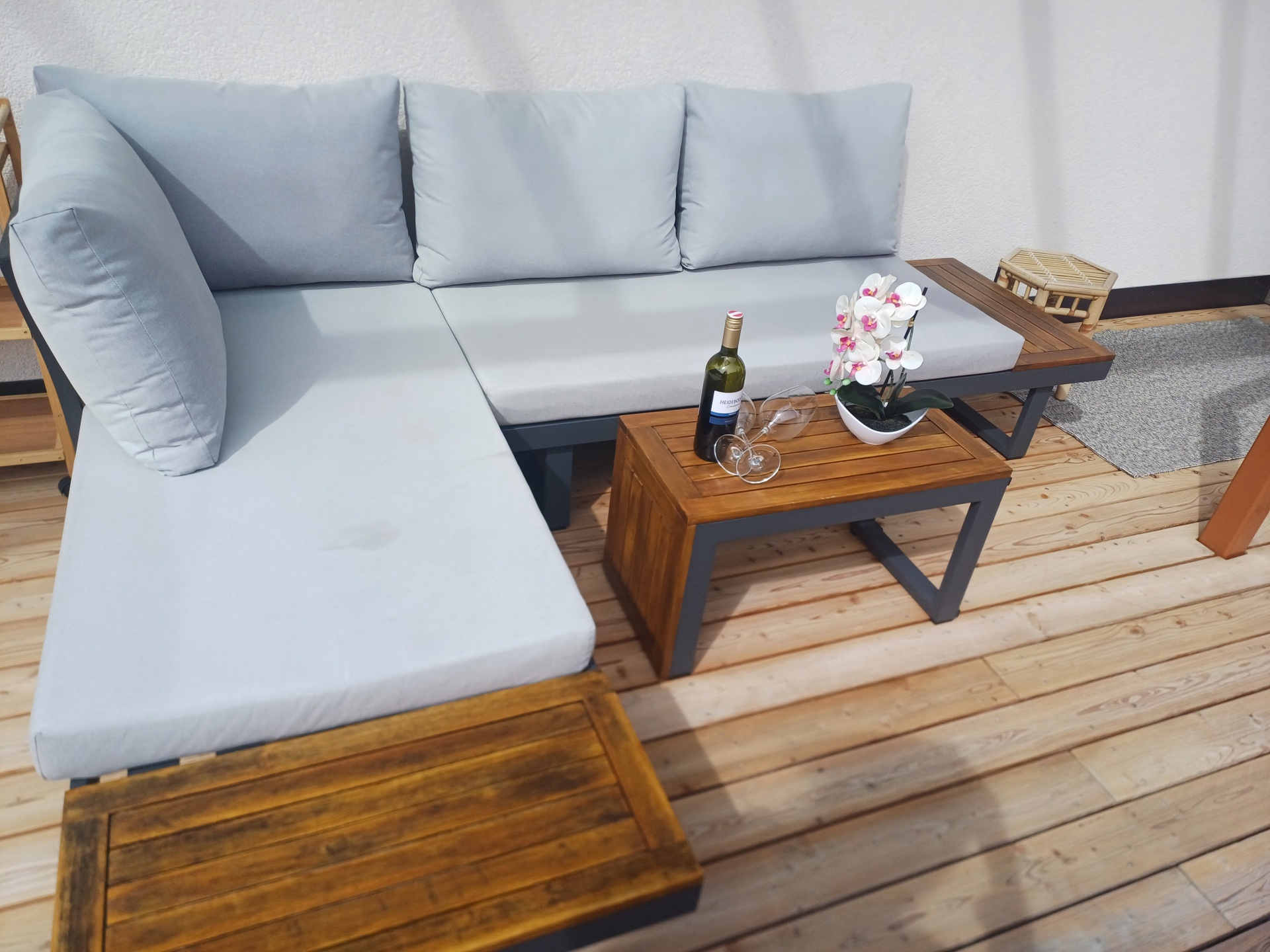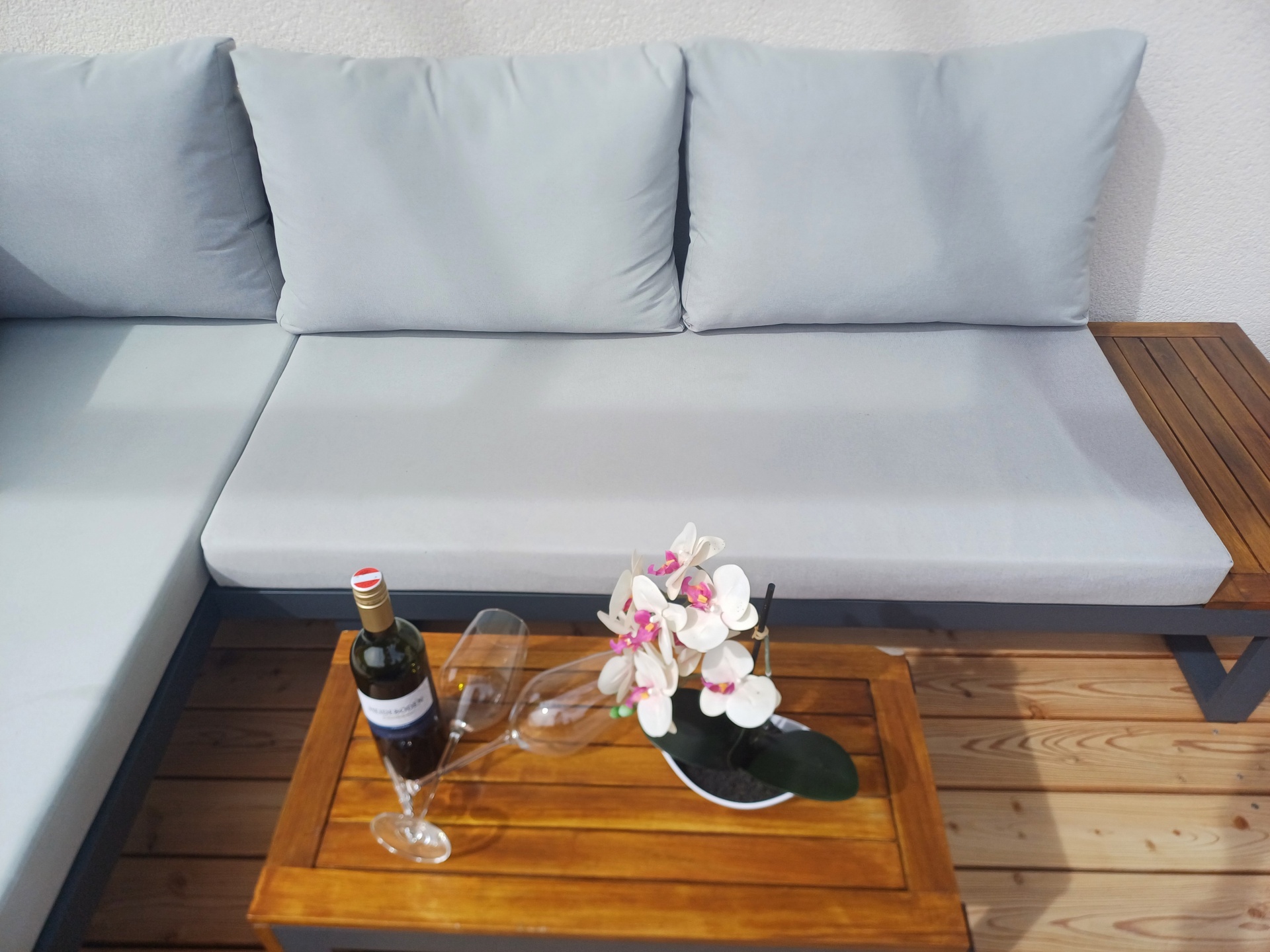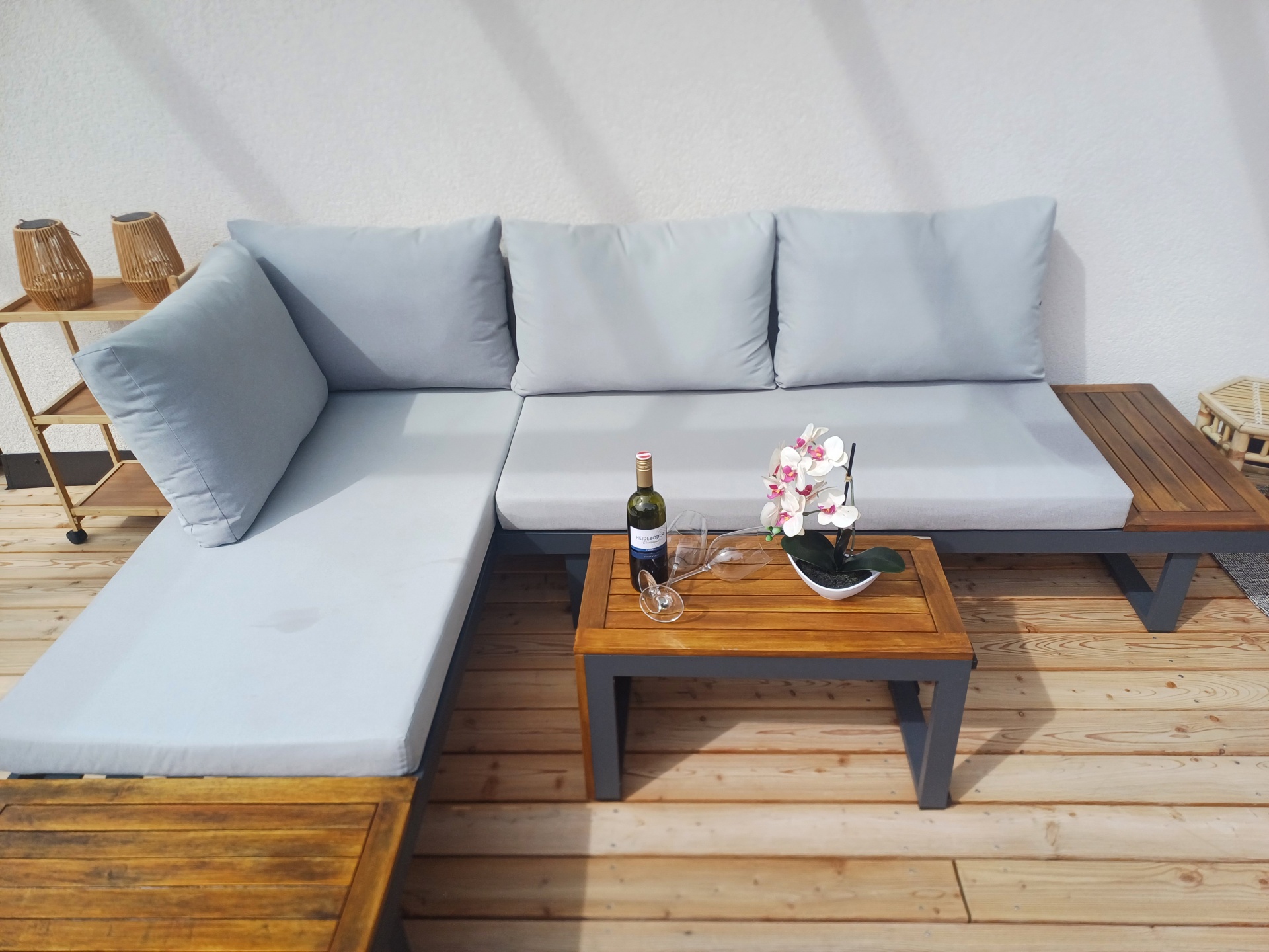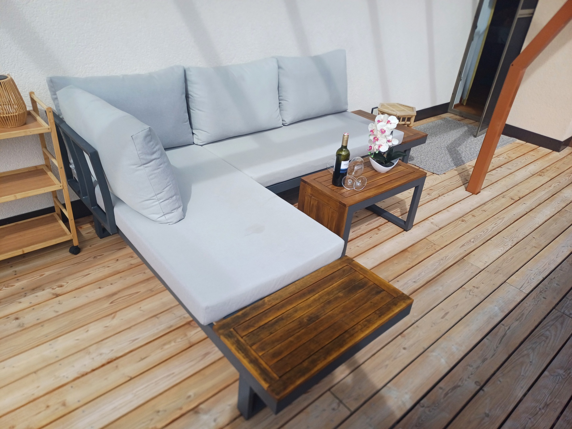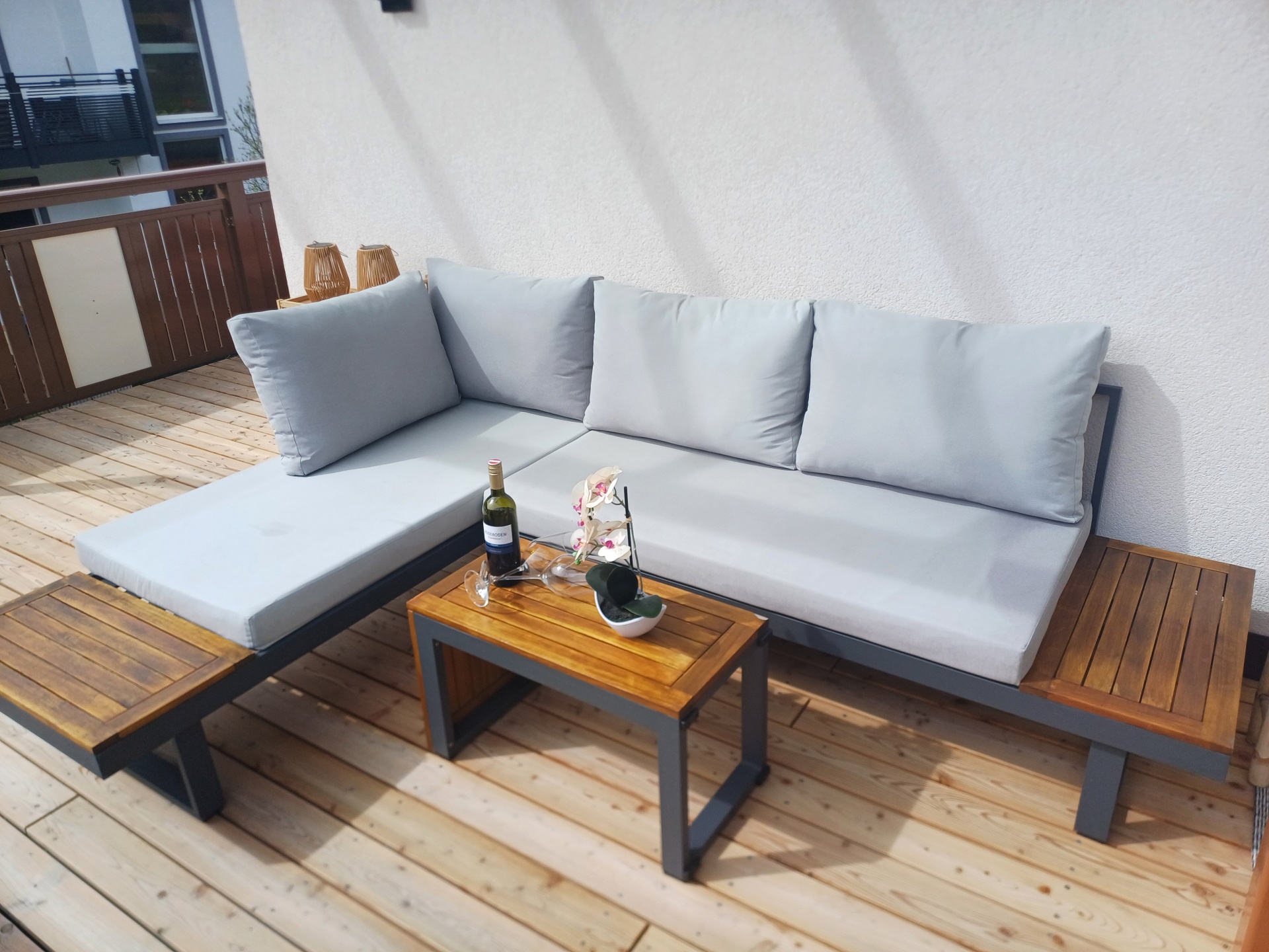 Balkonlounge neuwertig aus Stahl mit Echtholz, kompletter Polsterung, variabel verstellbar