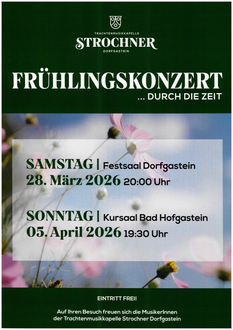Die Trachtenmusikkapelle Strochner hat unter der musikalischen Leitung von Kapellmeister Simon Rieser ein anspruchsvolles Musikprogramm vorbereitet. Genießen Sie diesen musikalischen Hörgenuß im Rahmen der beiden Frühlingskonzerte im Festsaal Dorfgastein und im Kursaal Bad Hofgastein.