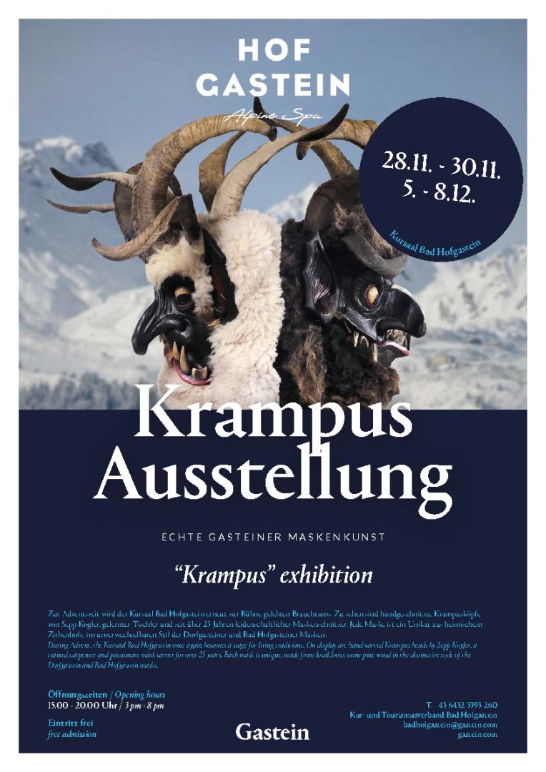 Zur Adventszeit verwandelt sich der Kursaal Bad Hofgastein fast schon traditionell in einen Ort lebendigen Brauchtums. Im Mittelpunkt stehen diesmal die handgeschnitzten Krampusköpfe von Sepp Kogler – ein gelernter Tischler, der seit über 25 Jahren mit Leidenschaft und Präzision Krampusmasken fertigt. Jede Maske ist ein einzigartiges Kunstwerk aus heimischem Zirbenholz, gestaltet im charakteristischen Stil der Dorfgasteiner und Bad Hofgasteiner Masken. Mit feinem Gespür geschnitzt, vermittelt jede Figur ihre eigene Ausstrahlung und macht die Tradition spürbar. Tauchen Sie ein in die geheimnisvolle Welt des Krampus und erleben Sie die meisterhafte Handwerkskunst eines echten Gasteiner Schnitzers.