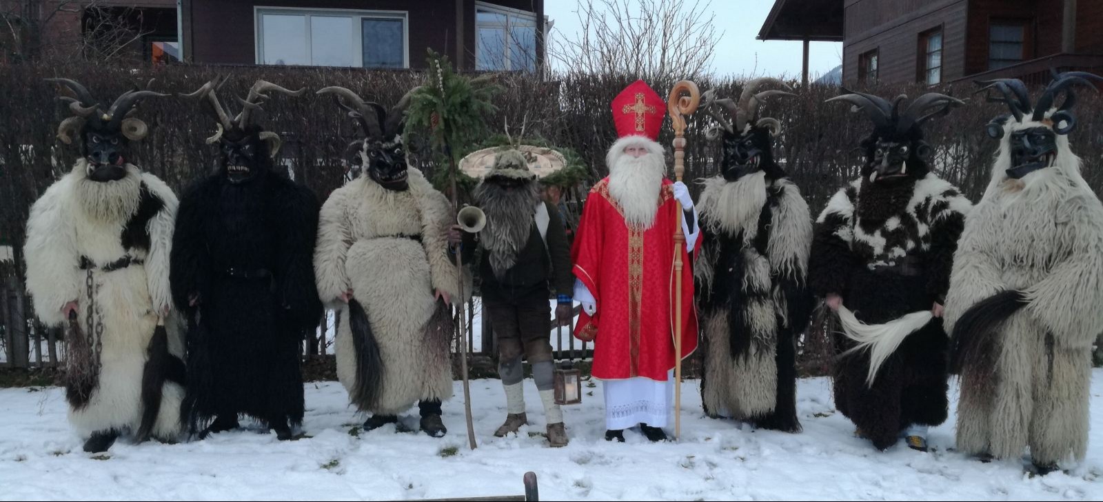 Nikolaus in rot gekleidet, Körblträger mit Palmbuschen am Stecken, Schaffell-Mäntel