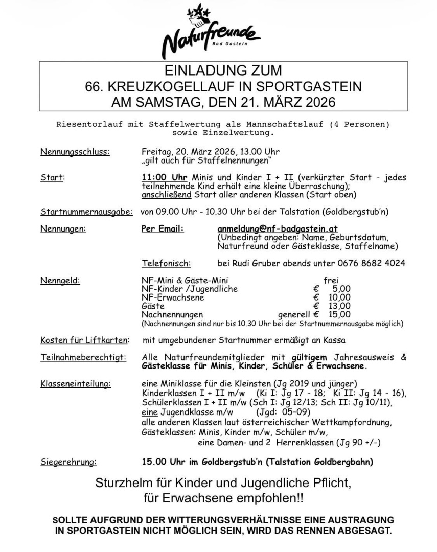 Bereits zum 66. Mal  veranstalten die Naturfreunde Bad Gastein den Kreuzkogellauf in Sportgastein, eines der beliebtesten Skirennen im Gasteinertal. Ausgetragen wird ein Riesentorlauf in Einzelwertung und einer Staffelwertung als Mannschaftslauf mit 4 Personen.