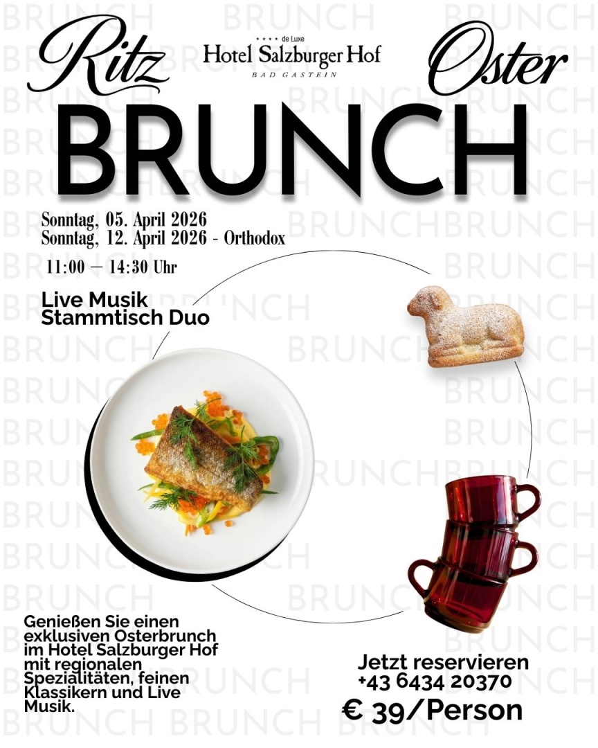 Verbringen Sie die Osterzeit genussvoll beim exklusiven Osterbrunch im Hotel Salzburger Hof in Bad Gastein. Freuen Sie sich auf ein reichhaltiges Buffet mit regionalen Spezialitäten, feinen Klassikern und liebevoll zubereiteten Köstlichkeiten – perfekt für einen entspannten Feiertag mit Familie und Freunden.
