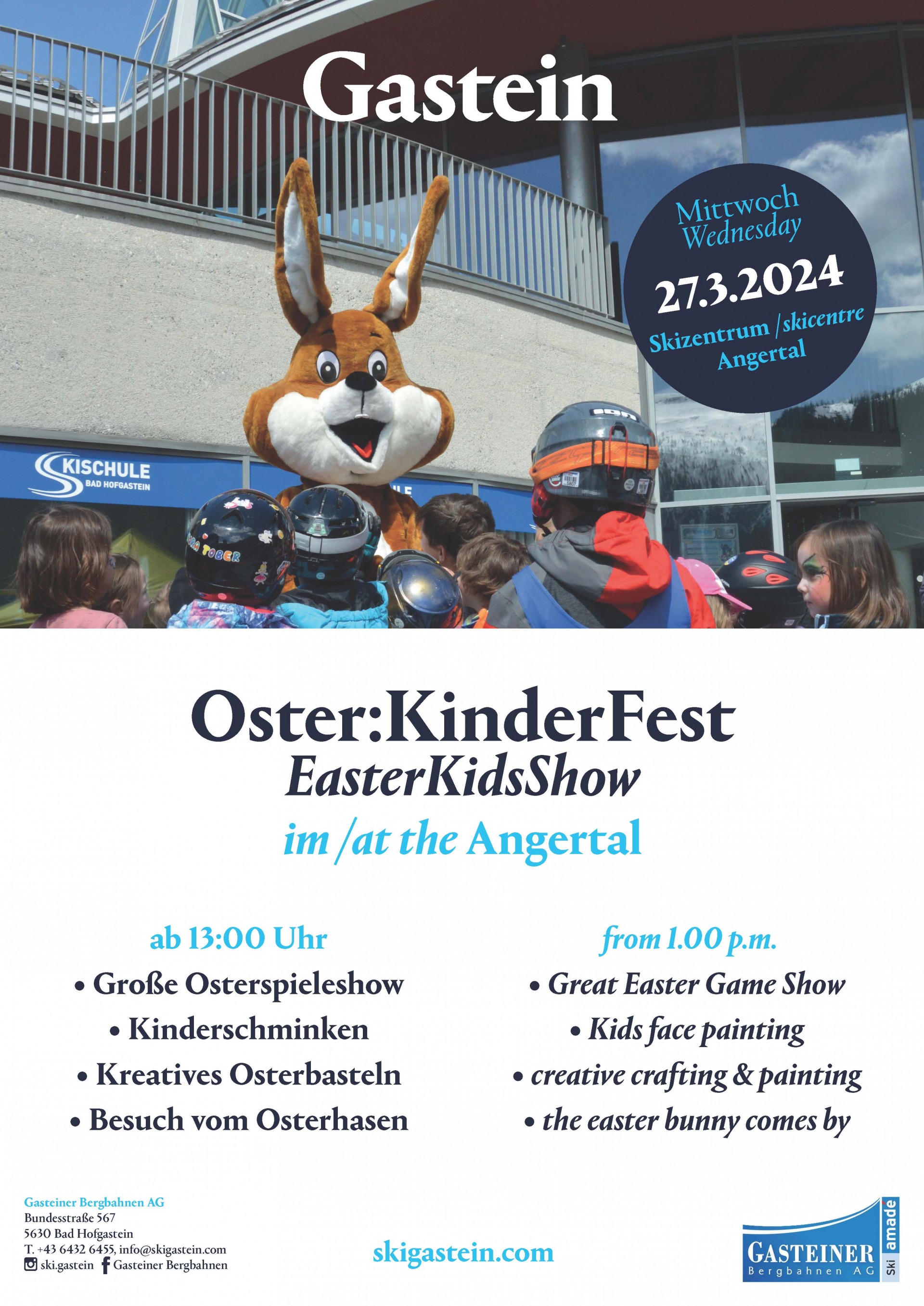 Der Osterhase besucht beim Osterfamilienfest das Skizentrum Angertal. Viele spannende Spiele und jeden Menge Spass mit eigenem Kinderprogramm, z.B. Blumenstecker für den Osterstrauch basteln, Ostereier gestalten und viel mehr...