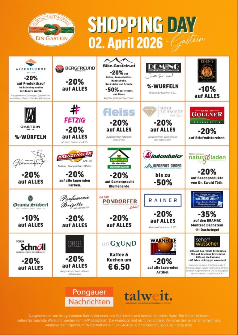 An diesen Aktionstagen bieten zahlreiche Gasteiner Betriebe und Geschäfte besondere Aktionen und Ermäßigungen.